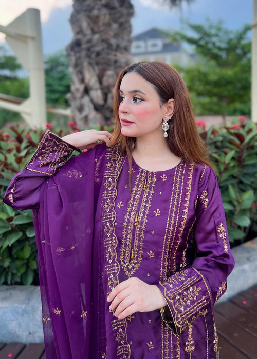 Indulge in the epitome of sophistication with 'Calestia SILKEN from Sufaidposh Crafted from sumptuous Silk, this enchanting ensemble boasts intricate panel embroidery adorned with a shower of sequin floral multi-embroidery on the shirt. Paired with an exquisi