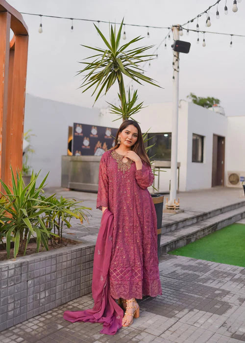 Experience elegance in the Qurbat dress by Sufaidposh. This stunning hued frock, measuring 51 inches, is crafted on luxurious chiffon with meticulous hand embroidery adorning the neckline. The intricately embroidered chiffon dupatta adds a touch of grace, while the silk trouser completes the ensemble with finesse. Elevate your style with the perfect blend of sophistication and tradition